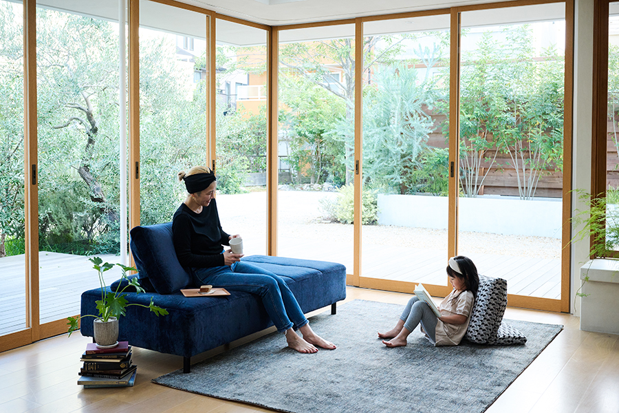 一人掛けソファとしても大活躍 足置きとして使うことの多いオットマンも、クッションレストをのせればあっという間に一人掛けのソファに。本を読んだり、庭を眺めながら日向ぼっこしたり。ここは自分だけの特別な時間を過ごす場所。