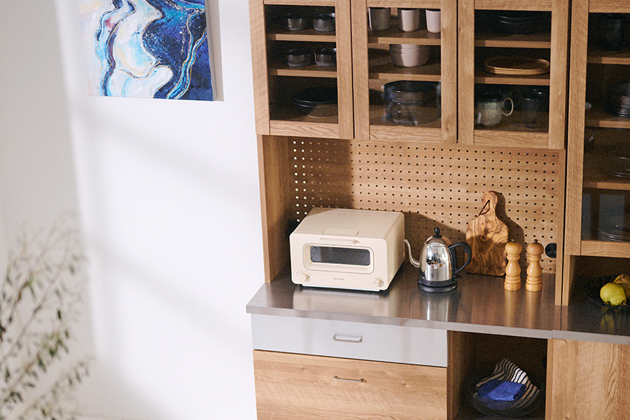 奥行きは、背の高い家具にありがちな「圧迫感」を軽減するよう上部 31cm、カウンターは50cmに設定。意外と見逃しがちな部分ですが、狭めなキッチンスペースでは棚上部の奥行き感は大事なポイントです。