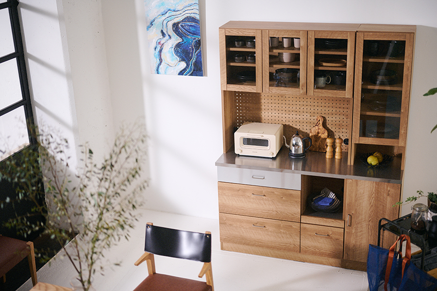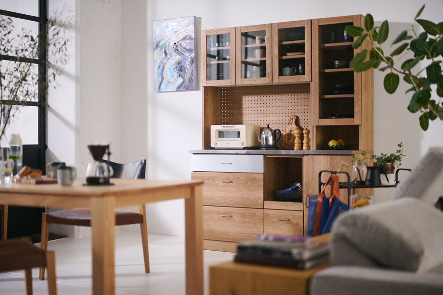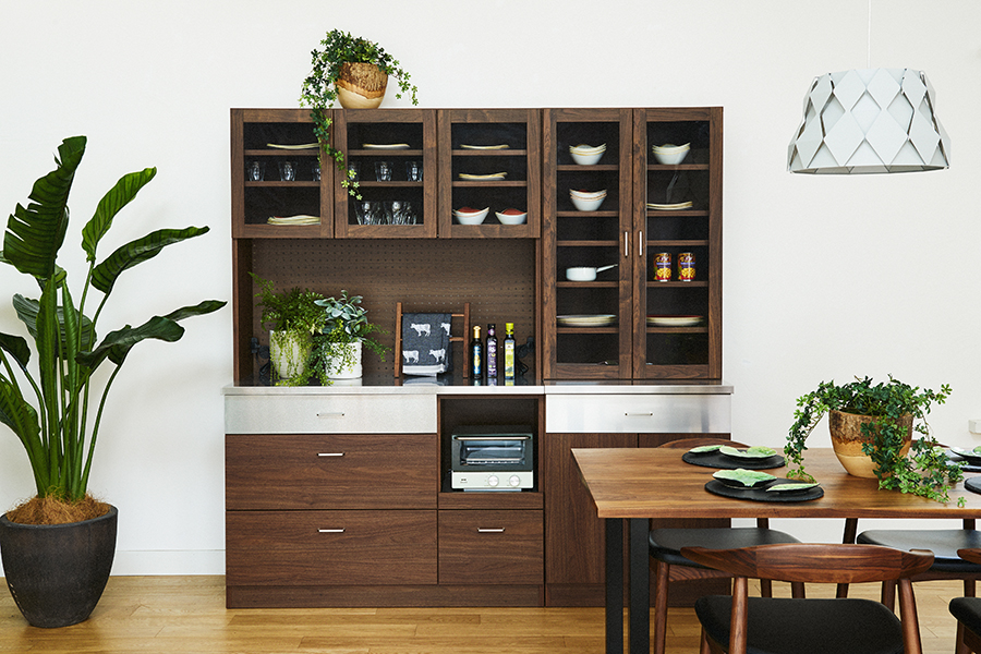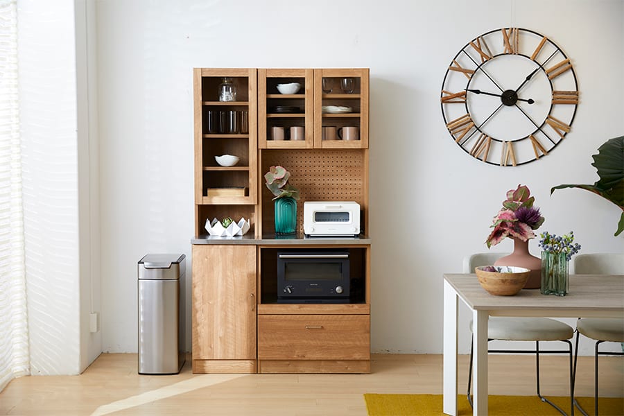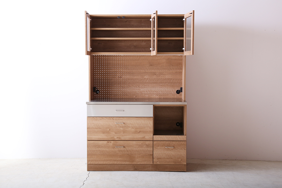 120オープンダイニングボード+70ダイニングボードの組み合わせ。ミニパントリーができたかのような収納力。ご家族が多い方や食器を集めるのがお好きな方におすすめです。