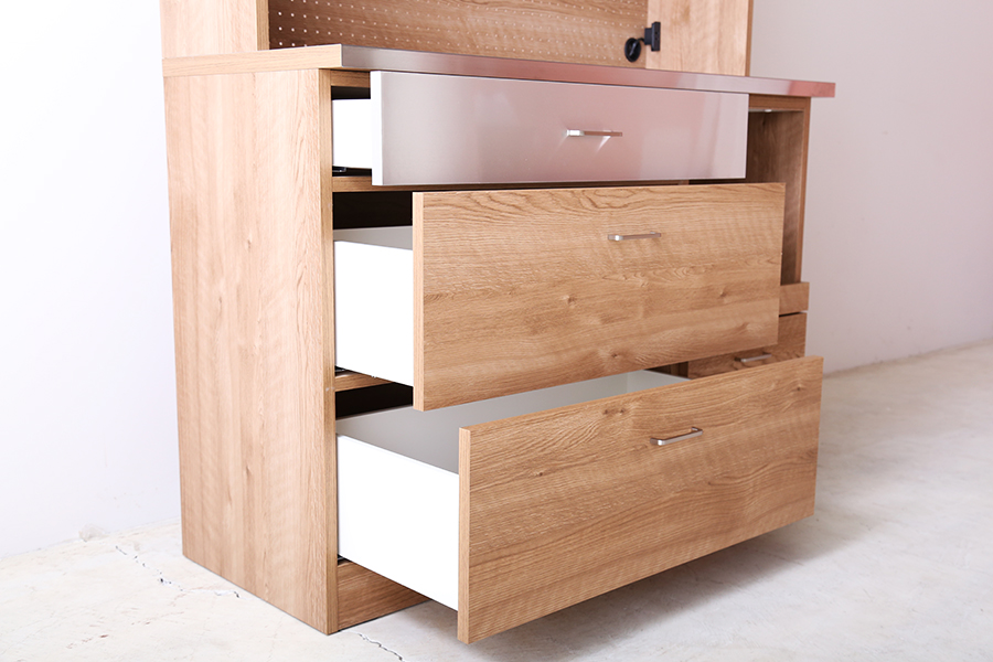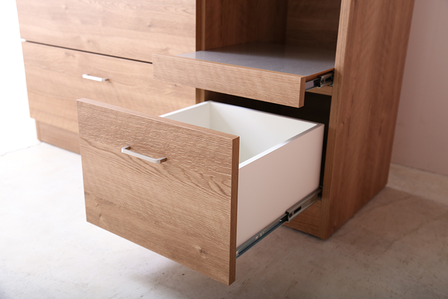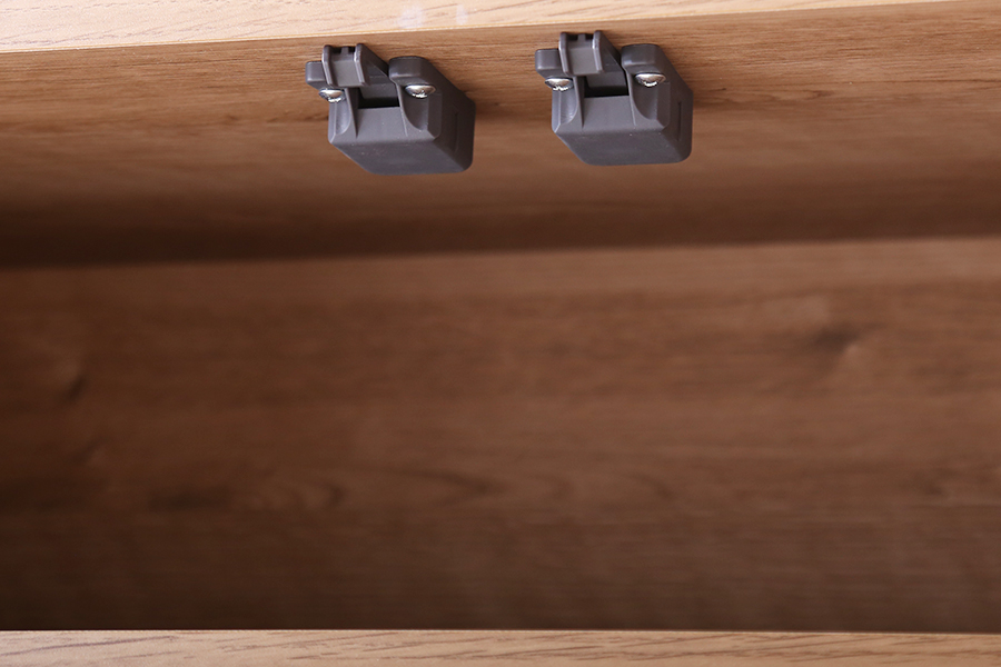 引き出しはセルフクローズ機能がついており、食器同士がぶつかることもなく静かに開閉ができます。(炊飯器置き下の引き出しは除く)