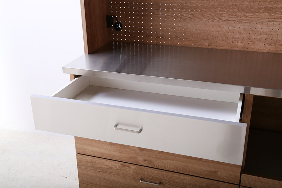 最大の特徴であるステンレスカウンターはステンレス製のキッチンアイテムとの相性もよく、空間全体に統一感が生まれます。また、油汚れなどのキッチンの汚れにも強いので、清潔に保てる実用的な側面も備えています。