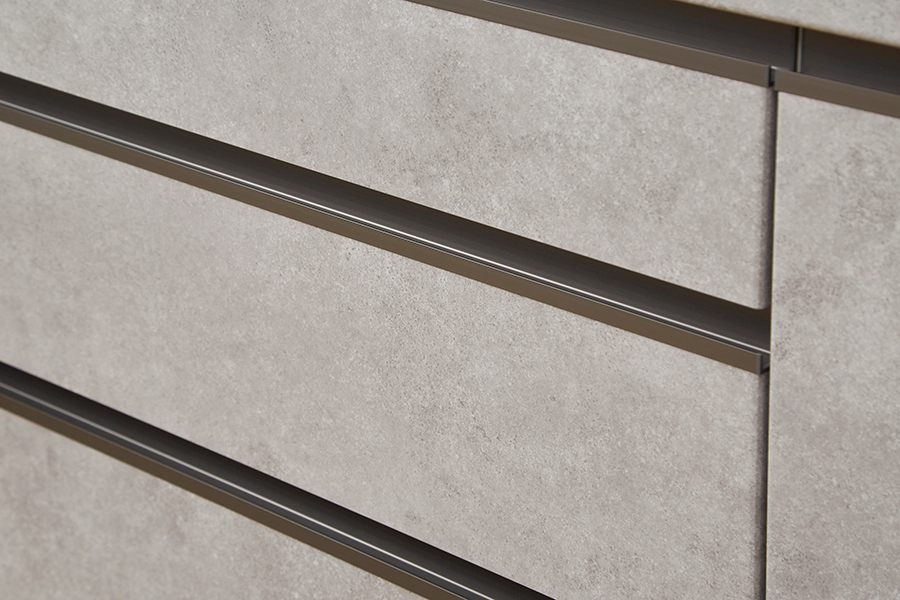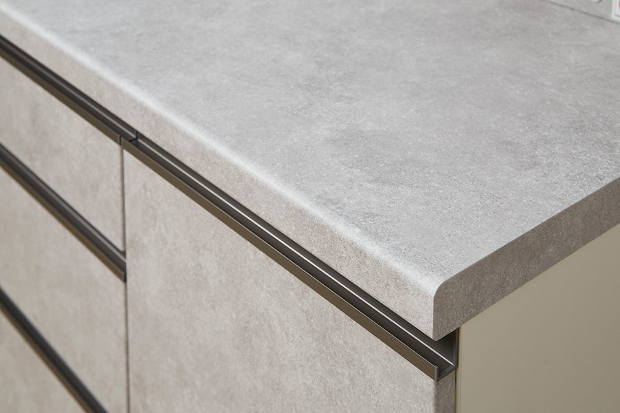 流行りのコンクリート調の模様が洗練されたモダンなキッチンを演出してくれます。取っ手も全体と調和したカラーに。