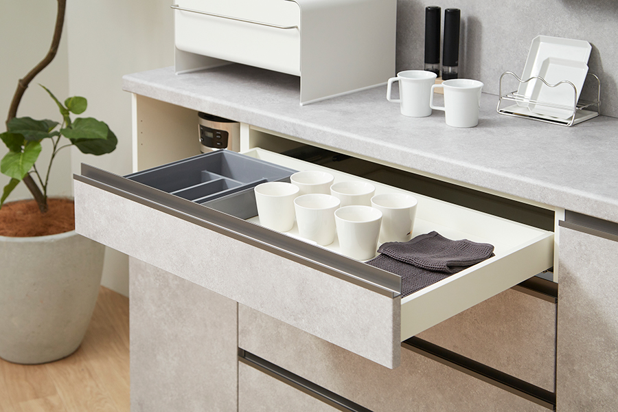 従来の引戸とは異なり、ワイドビュー設計の引戸を採用しました。扉がフルオープンになるためすべての食器が見やすく、出し入れも簡単に行えます。中の棚板は高さ調整が可能です。