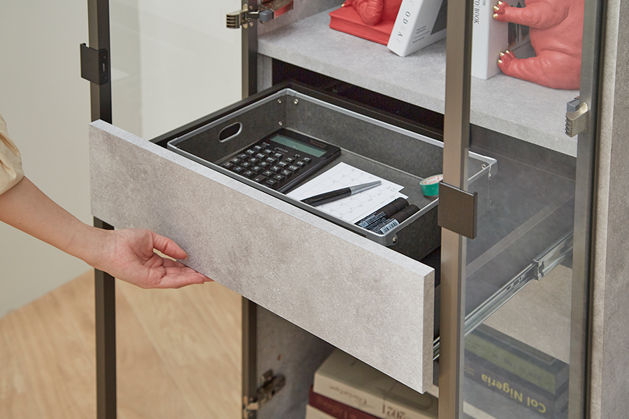 幅の内寸 43cm の内引出が2杯。普段よく使う文房具や封書などを入れておくのに便利なコンパクト収納です。フルオープンなので奥に入れたものも取り出しやすい仕様です。