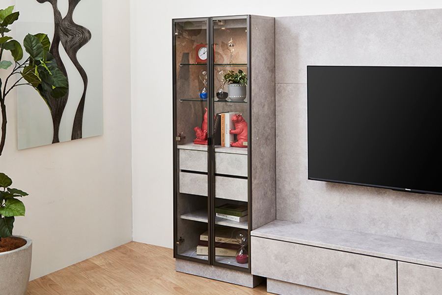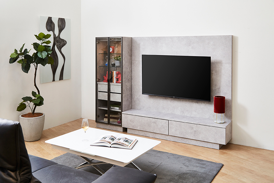 同シリーズのテレビボードはサイズを3種類からお選びいただけます。キュリオケースを追加することで「飾る」と「隠す」を両立でき、テレビ周りを有効活用できそうです。