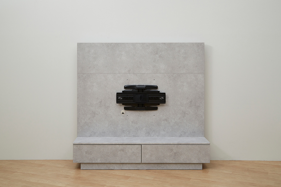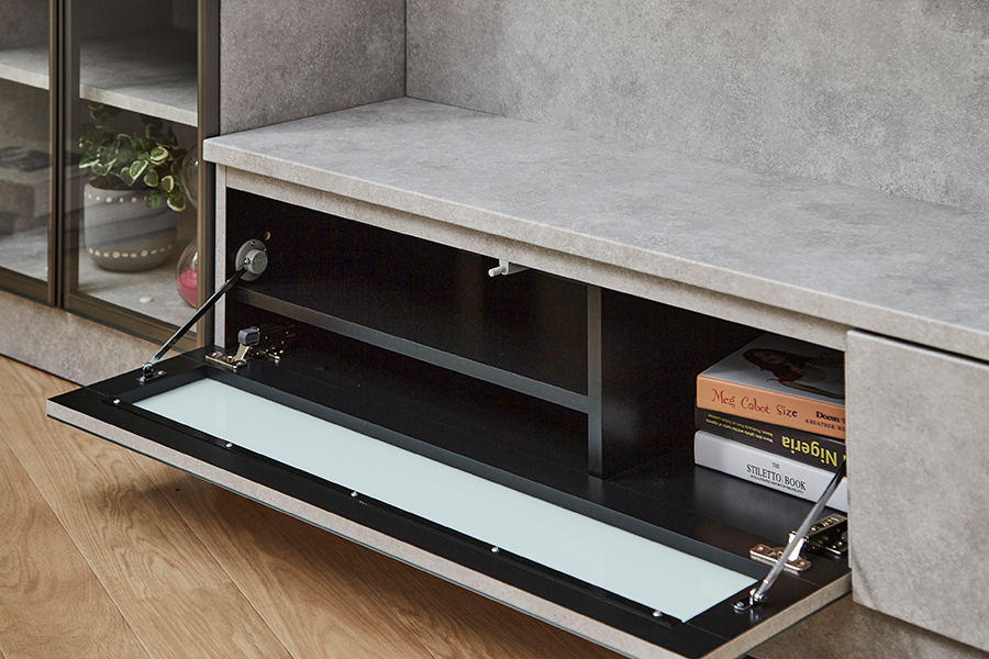 下台の左側はフラップダウン式。中部の仕様が2種類に分かれているためデッキやゲーム類、Wifiルーターなども収納しやすく便利です。配線をテレビボード中に集約できるため見た目もすっきり。フラップ式の扉は閉めたままでもリモコン操作が可能です。
