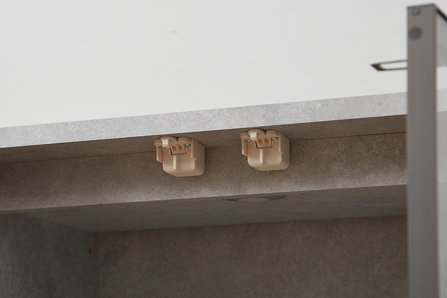 キュリオケース扉上部には耐震ラッチが付いており、地震の際には振動センサーが反応して扉を固定してくれます。棚板はガラス棚が2枚、通常仕様の棚板が1枚付属しており、飾りたいアイテムの高さに合わせて調整していただけます。