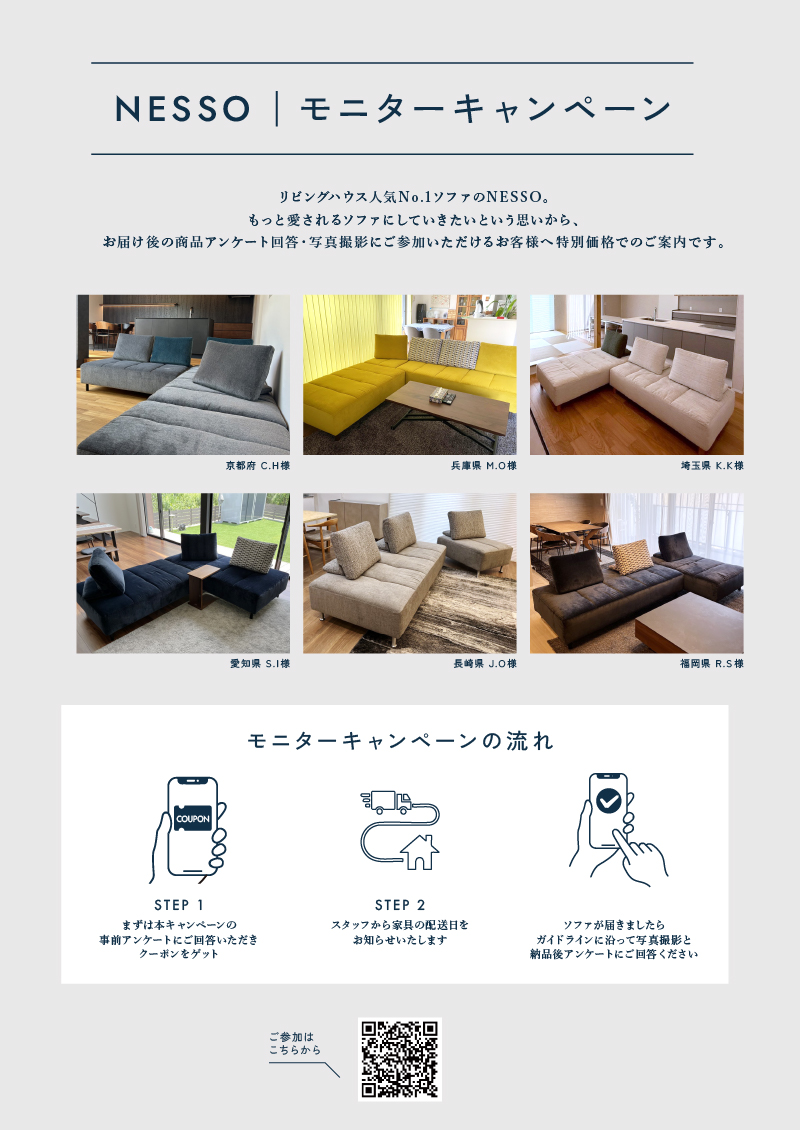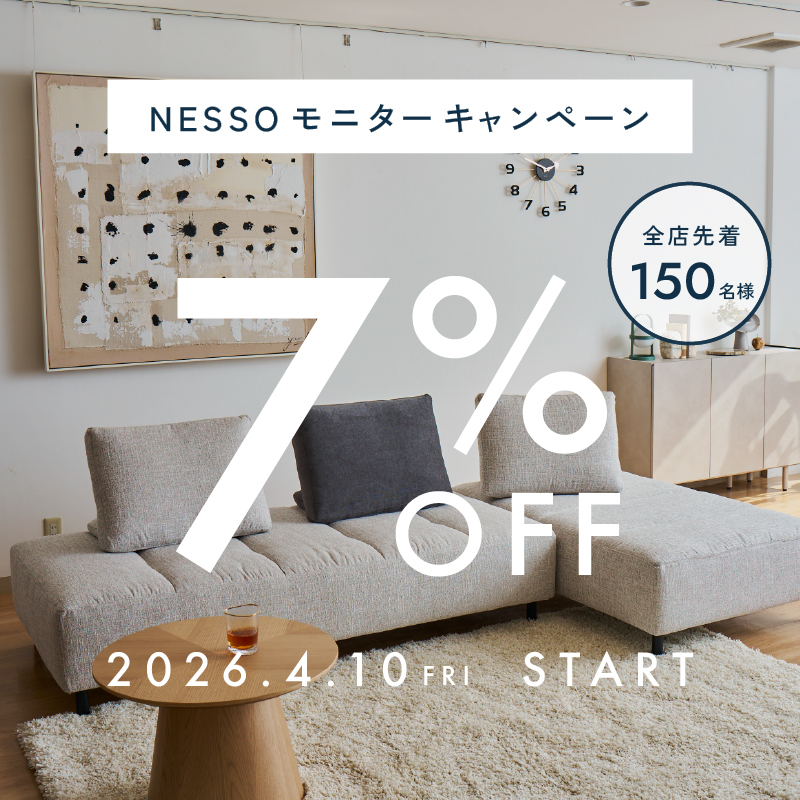 モニターのご登録で、NESSOソファ7%OFFとなる